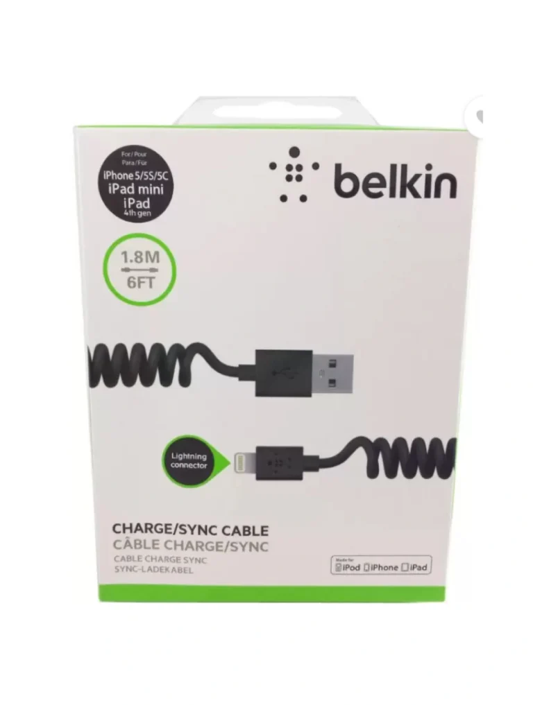 BELKIN Lightning Cable 1.8 m Spring Coiled Sync & Charge Lightning to USB Cable for iPhone 5 / 5S & iPod Touch 5G (Compatible with All Smartphones, Tablets and MP3 player, Black, One Cable)