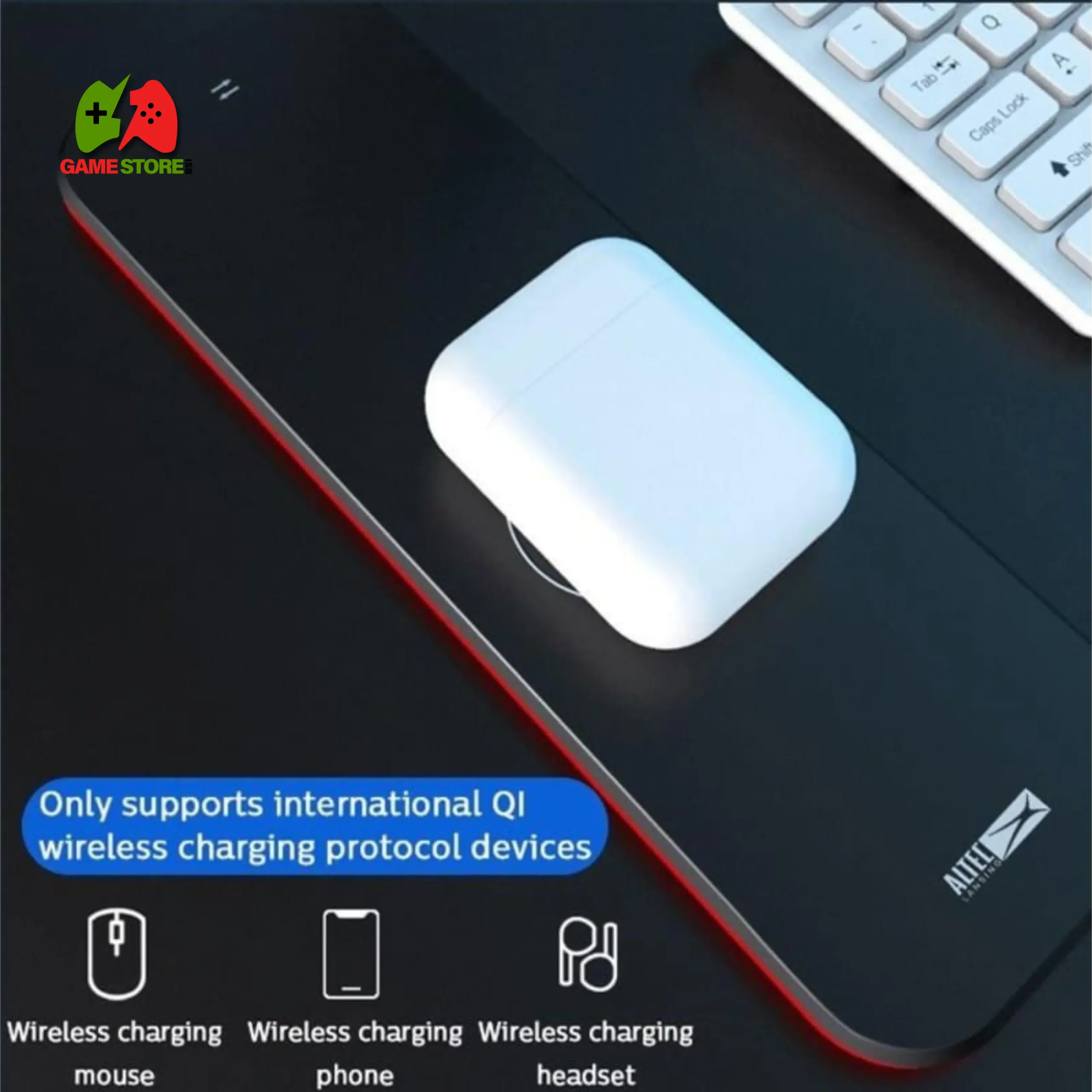 The Altec Lansing ALMP7604 Gaming Mouse Pad features an expansive design with integrated wireless charging, providing a tidy and convenient setup, broad compatibility with various devices, and a comfortable surface for seamless gaming and work tasks.
