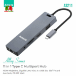 Expand your USB-C device’s capabilities with the Amaze A3211 11-in-1 Multiport Hub, featuring 4K HDMI, 100W Power Delivery, Gigabit Ethernet, VGA, multiple USB ports, SD/TF card readers, and 3.5mm audio—all encased in a sleek aluminum alloy design.