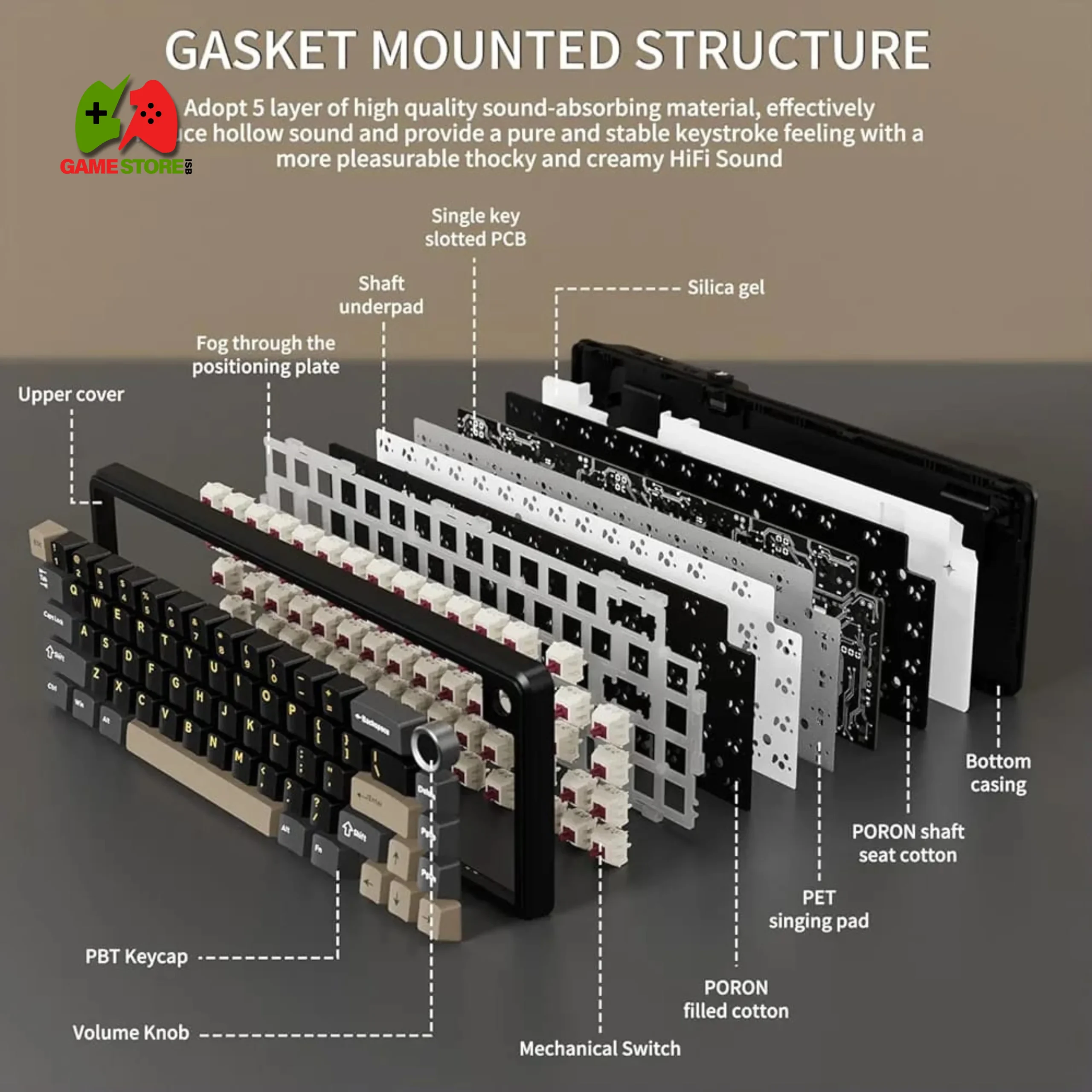 Up to five devices may be switched between with ease thanks to the tri-mode connection system (USB-C cable, 2.4GHz wireless, and Bluetooth 5.0), and the 3000mAh battery guarantees sustained performance for both work and pleasure. FN+Backspace turns on a battery level indicator, and smart indicator lights show charging status, caps lock, and win lock.