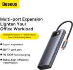 The Baseus Metal Gleam Series 6-in-1 Multifunctional Type-C Hub Docking Station in Gray is a versatile and stylish accessory designed to expand the connectivity of your USB Type-C enabled devices. With its sleek metal construction and comprehensive array of ports, this docking station offers a convenient solution for users who need to connect multiple peripherals to their laptops, tablets, or smartphones.