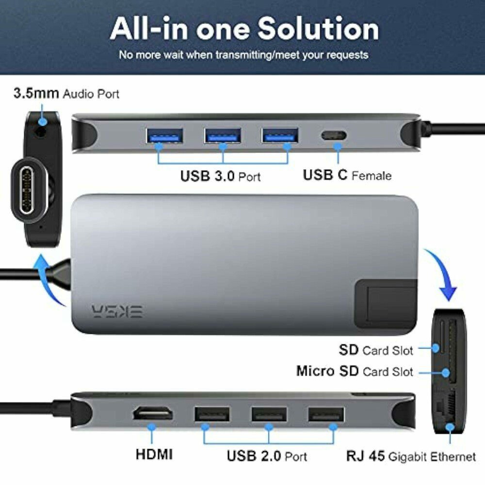 • 12 in 1 USB Type C Hub:EKSA multiport type-c adapter has come as the most integrated Multifunctional type c adater out there. It takes everything you want into consideration including 3 USB 3.0 ports, 3 USB 2.0 Port, 4k HDMI, RJ45 Gigabit Ethernet, 3.5mm