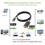 • RESOLUTION SUPPORTED: 1920×1080@60Hz (1080p Full HD) including 720p, 1600×1200, 1280×1024 for high definition monitors or projectors,The cable contains a Built-in Active IC Chip, convert digital HDMI signal to analog VGA signal directly