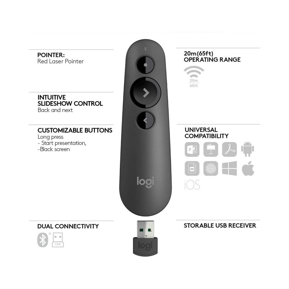Deliver impactful presentations with the R500 Laser Presentation Remote. Move freely and navigate slides from up to 65 feet (20 meters) away – and point out precise areas of focus with the red laser pointer. The R500 is optimized to work with Windows®, macOS® and leading presentation software.