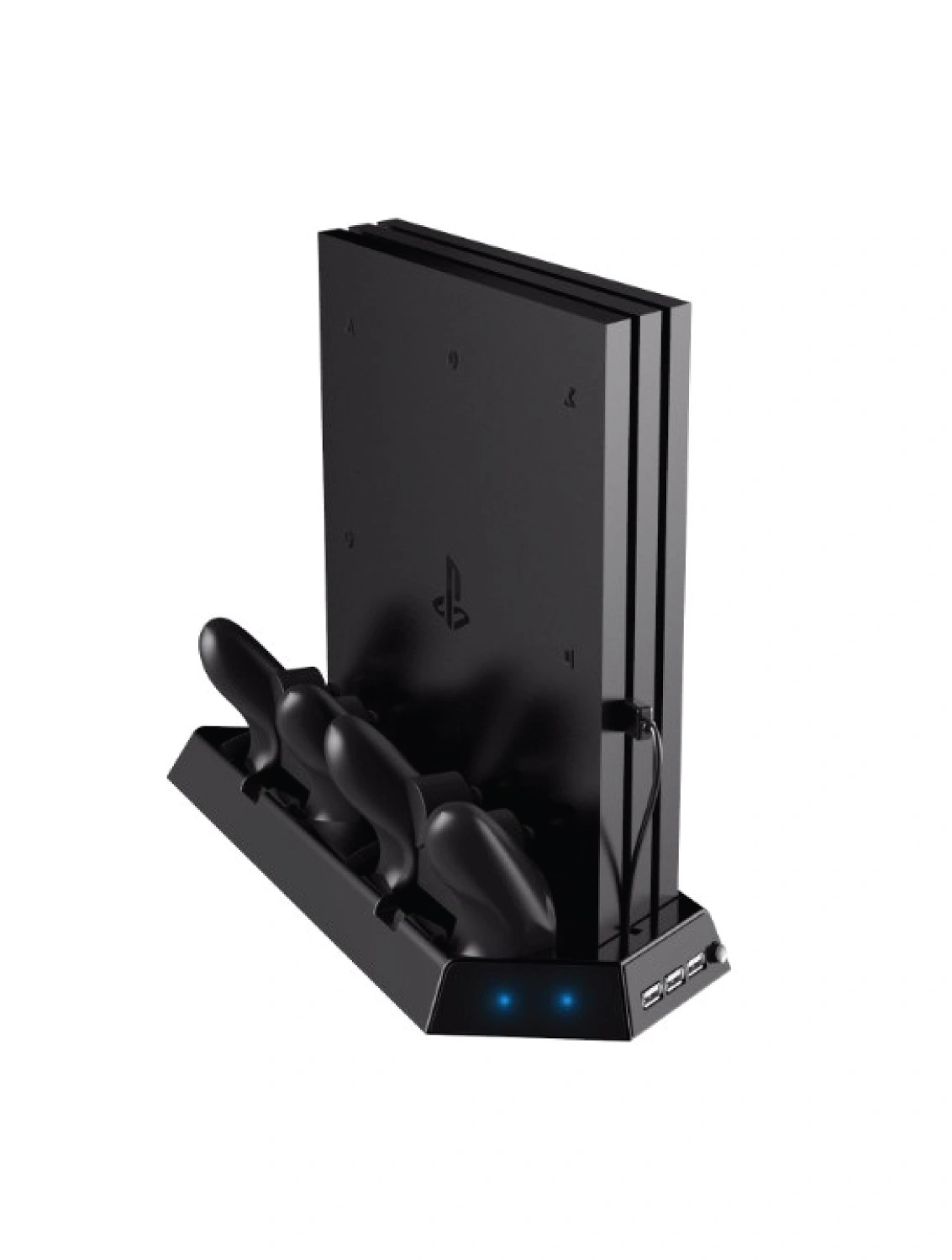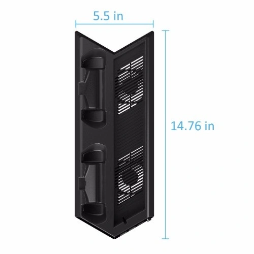 Keep your console steady while vertical with controller charging function;Unique Appearance design, fashionable and cool;Exact fit for PS4 slim console and controllers;Cooler Fan for PS4 slim console, 2 built-in fans to disperse heat from your console, improve the operational life span;Two controllers can be charged simultaneously, simple operation;Expand USB ports, convenient for connecting more USB devices;No extra power supply needed.