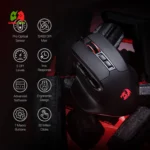 The mouse features dynamic RGB backlighting with multiple modes, adding a vibrant touch to your gaming setup. All settings, including button assignments, DPI levels, and lighting effects, can be customized using Redragon’s dedicated software.